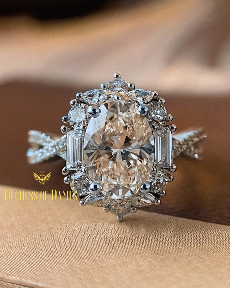 A captivating blend of luxury and timeless elegance, the Leila Ring features a brilliant oval-cut moissanite surrounded by a radiant halo of marquise, round, and baguette stones. Its platinum-plated, premium sterling silver infinity twist band adds sophisticated charm, symbolizing an unending bond and refined beauty.